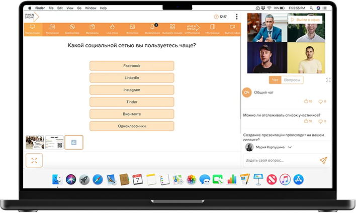 Гибкость проведения Опросы можно подготовить заранее для экономии времени или запустить спонтанно во время вебинара, чтобы заполнить техническую паузу или оживить обсуждение.
